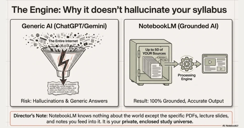 NotebookLM is Google’s AI research tool that works differently from ChatGPT or Gemini. Those tools pull from everything they’ve ever been trained on. NotebookLM only uses what you give it — your PDFs, your notes, your textbooks, your lecture slides. Nothing else.