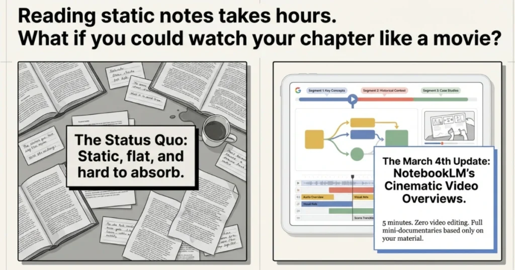 Your notes have always been your best study tool. The problem was they were just sitting there — static, flat, boring to re-read. NotebookLM Cinematic changes the relationship between you and your own material.